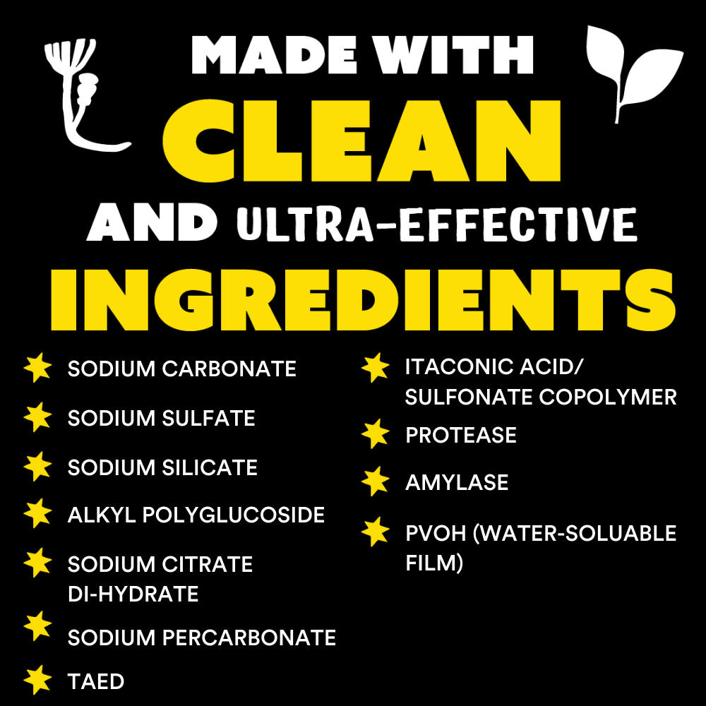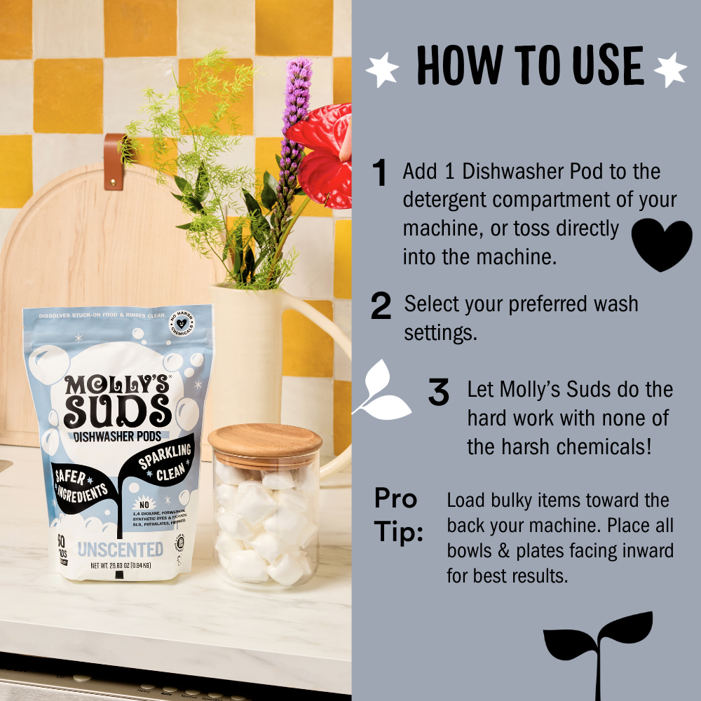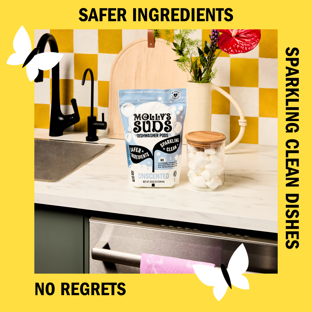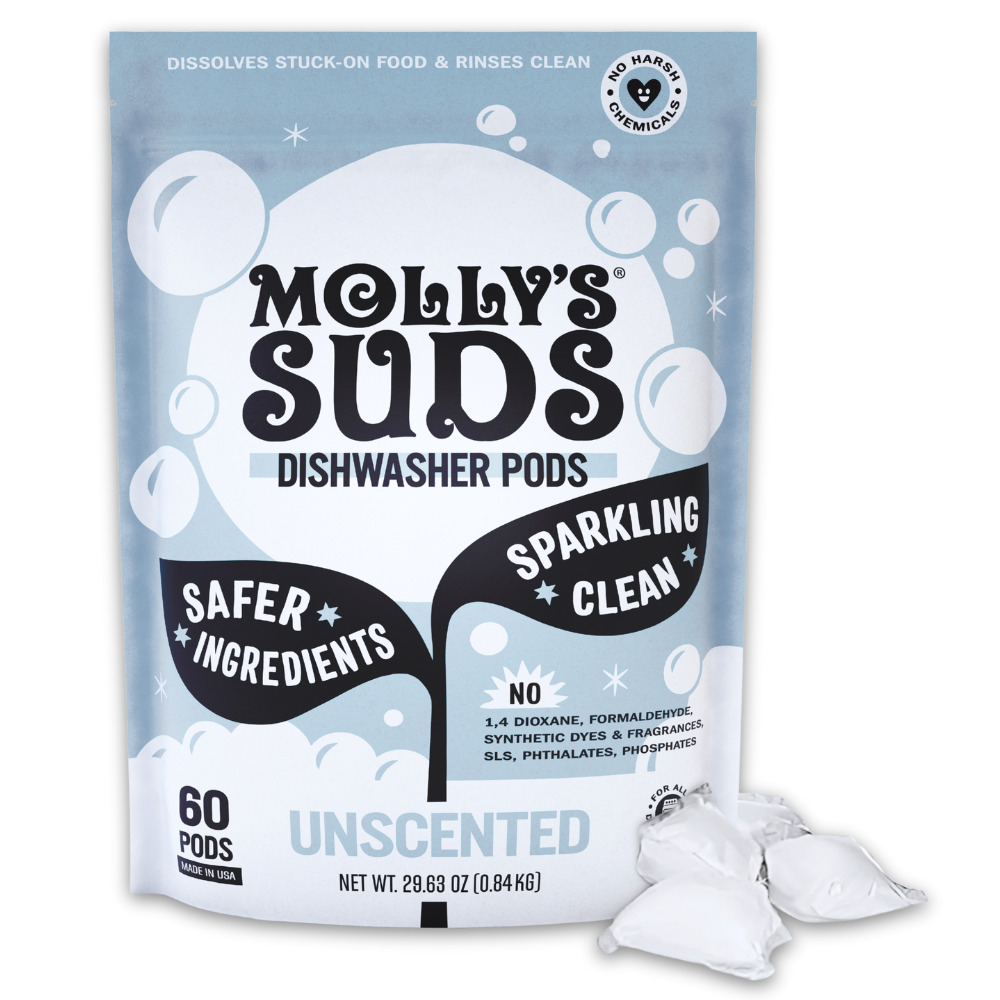 • Simple and effective, Molly’s Suds Dishwasher Detergent Pods are free from Ethoxylates, Parabens & Phthalates, and Synthetic Dyes or Fragrances.