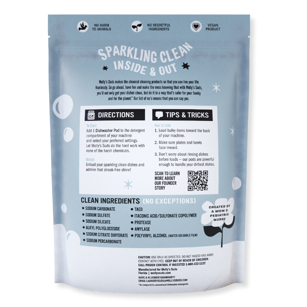 Molly’s Suds makes the cleanest cleaning products so that you can live your life fearlessly. Developed by a pediatric nurse & mom, our Dishwasher Detergent Pods deliver sparkling clean dishes WITHOUT unnatural colors or dyes, artificial scents, or other harsh chemicals. Formulated with plant-based surfactants and active enzymes from mother nature, Molly's Suds Dishwasher Pods cut through grease & stuck-on food stains to leave dishes sparking with less residue, streaks, or other mineral build-up. Molly’s Suds Dishwasher Detergent Pods are free from ethoxylates, are certified Cruelty-Free by Leaping Bunny and are concentrated product to help conserve our Earth's most precious resource. So go ahead, have fun and make the mess knowing that with Molly’s Suds, you’ll not only get the dirt out, but do it in a way that’s safer for your family and for the planet. Our list of no’s means that you can say yes.