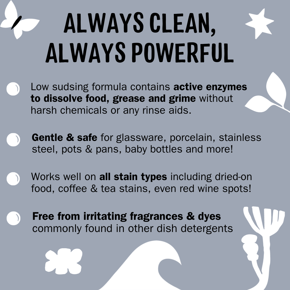 • Ultra-clean formula utilizes active enzymes to dissolve food, grease & grime without the need for harsh chemicals or any rinse aids, leaving dishes sparking with less residue, streaks, or other mineral build-up.