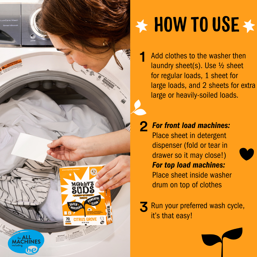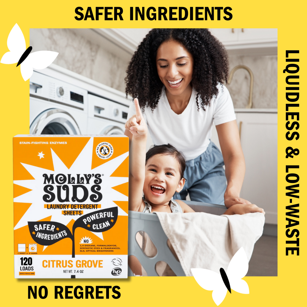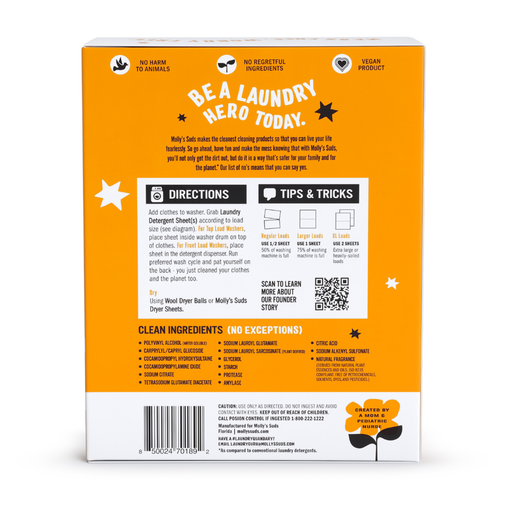 Molly’s Suds makes the cleanest cleaning products so that you can live your life fearlessly. Developed by a pediatric nurse & mom, our Laundry Sheets deliver a safer clean that is better for you AND the planet. Formulated with simple yet effective ingredients, Molly's Suds is gentle on your skin AND your wallet, and will NEVER contain 1,4 Dioxane, Formaldehyde, Synthetic Dyes & Fragrances, SLS, Optical Brighteners or other harsh chemicals. Molly's Suds Laundry Sheets are concentrated product to help conserve our Earth's most precious resource. So go ahead, have fun and make the mess knowing that with Molly’s Suds, you’ll not only get the dirt out, but do it in a way that’s safer for your family and for the planet. Our list of no’s means that you can say yes.