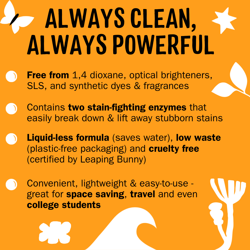 • Earth-friendly clean, offering a liquidless formula and plastic-free packaging solution to reduce water consumption and plastic pollution.